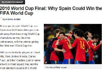 值得注意的是,《露天看台》也打造了一篇“荷兰夺冠的7大理由”,内容其实大同小异。美国人这两篇“公正”的预测其实是废话,决定比赛结果的终究是出现在决赛场上的那些球员。
